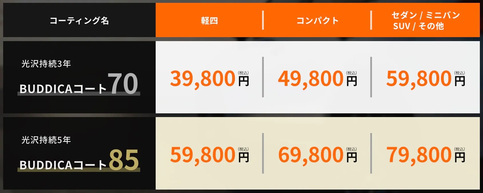 バディカでは、BUDDICAコートと呼ばれる独自のコーティングサービスを提供している。価格は39,800〜79,800円と、メーカーの正規ディーラー価格と比べるとかなりリーズナブルだ。