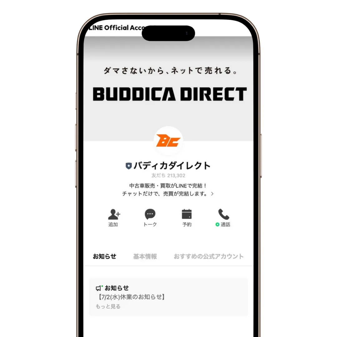 バディカの公式LINEアカウントは21万人以上が友だち登録しており、多くの人がLINEで相談・商談している。忙しくて店舗に足を運べない人や、自宅付近に店舗がない人は、LINEで車の購入・売却について相談してみよう。