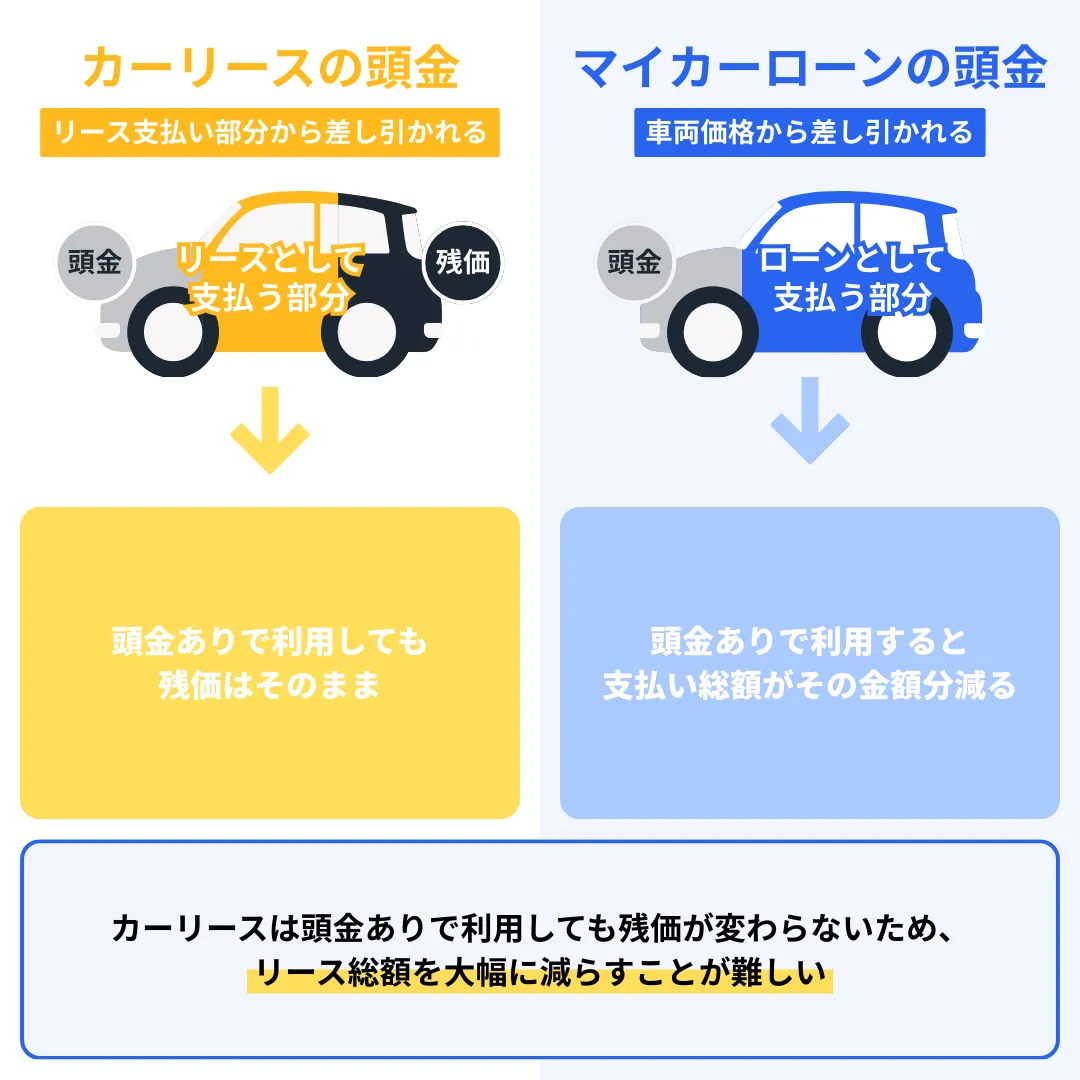 上記のとおり、カーリースは車両価格から残価を差し引き、リースとして支払う部分を確定する。頭金はこの部分から差し引かれるため、リース契約時に設定した残価は変わらない。つまり、カーリースを頭金ありで利用しても、残価に対して発生する利息(手数料)は一定である。
