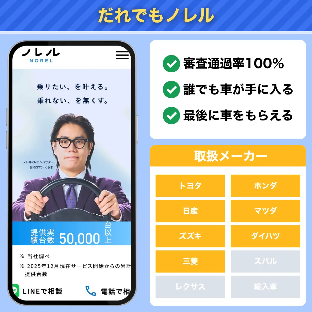 島根で利用できる審査なしのカーリースは、ノレルです。ノレルは独自の審査システムを採用しているので、審査通過率100%を実現しています。いくつかのカーリースの審査に落ちてしまった人は、ノレルを利用してみましょう。