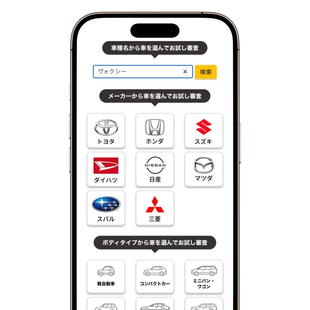 画面を下にスクロールすると車種検索画面が表示されるため、車種名を入力したりメーカーを選択したりして、乗りたい車を検索しよう。