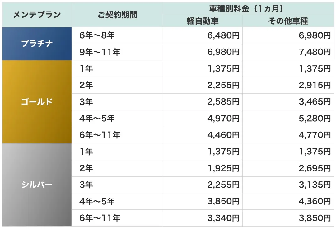 カーリースカルモくんのメンテナンスプランは、プラチナ・ゴールド・シルバーの3つだ。
