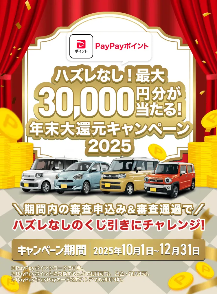 こうしたキャンペーンに応募した上でカルモくんを利用すれば、お得にマイカーを手に入れられるチャンスがある。ちなみに、上記のキャンペーンはハズレなしだ。30名に5,000円分のPayPayポイントが当たり、ハズレても300円分のPayPayポイントがもらえる。