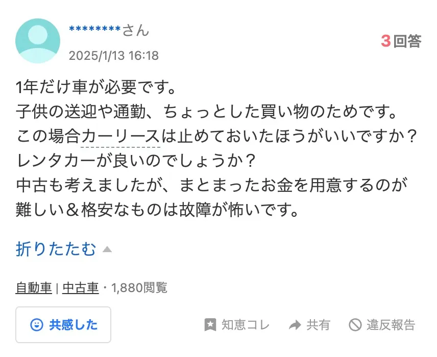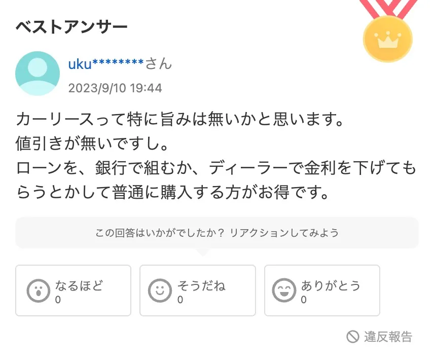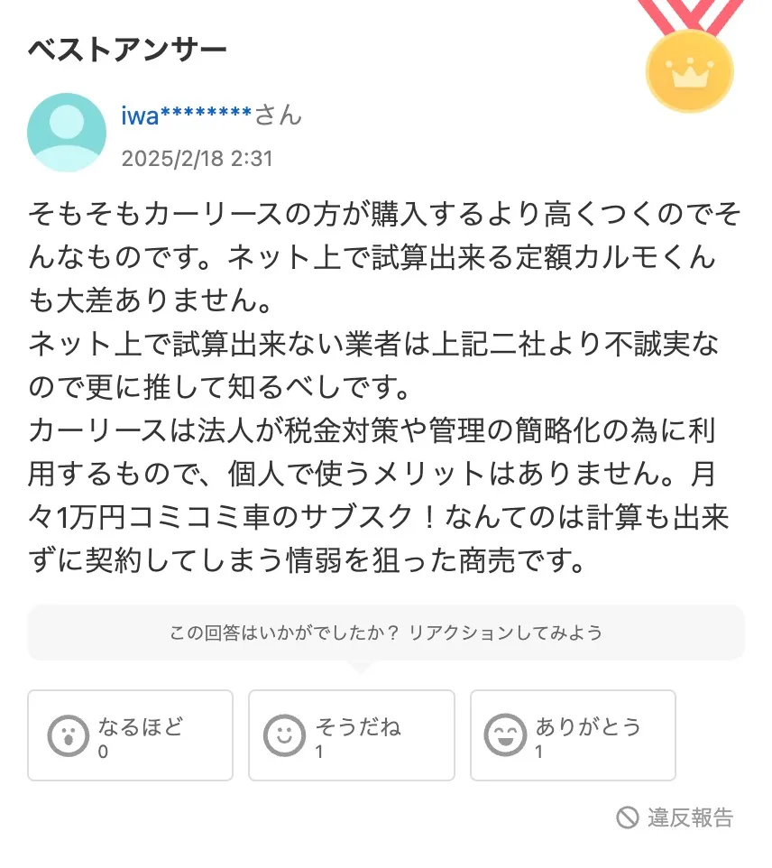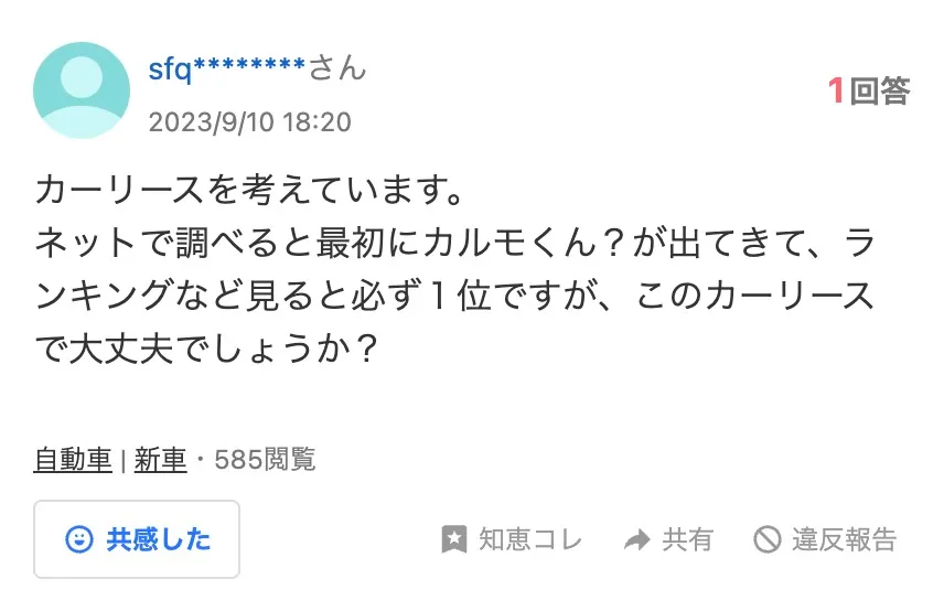 Yahoo!知恵袋に寄せられている「カルモくんはやめとけ」の声は、「車を買うよりも高い」「リースは法人が利用するもの(個人が利用するメリットはない」といった意見が多い。