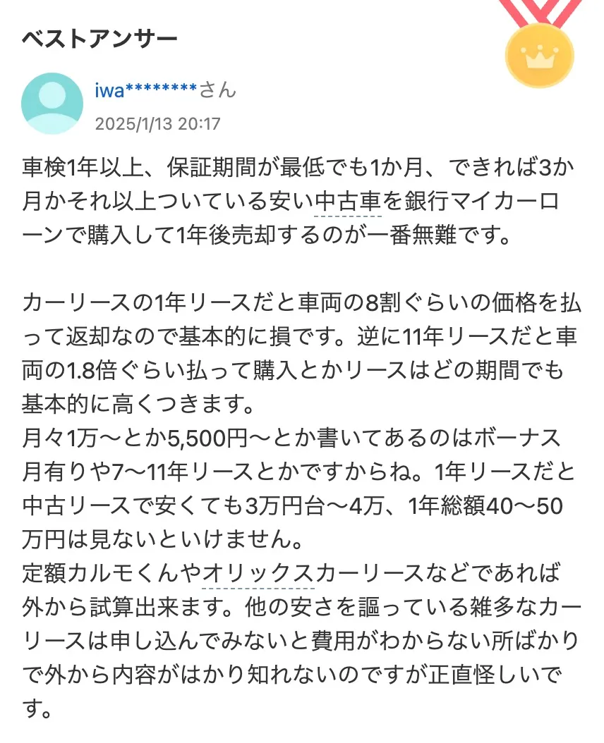 この質問の回答者は、1年だけ車を使用するなら銀行マイカーローンを組んで中古車を購入することを推奨している。確かに、銀行マイカーローンは金利が低く、中古車なら車両代金も抑えられる。しかし、1年だけ車を利用する場合は、必ずしも中古車がお得とは限らない