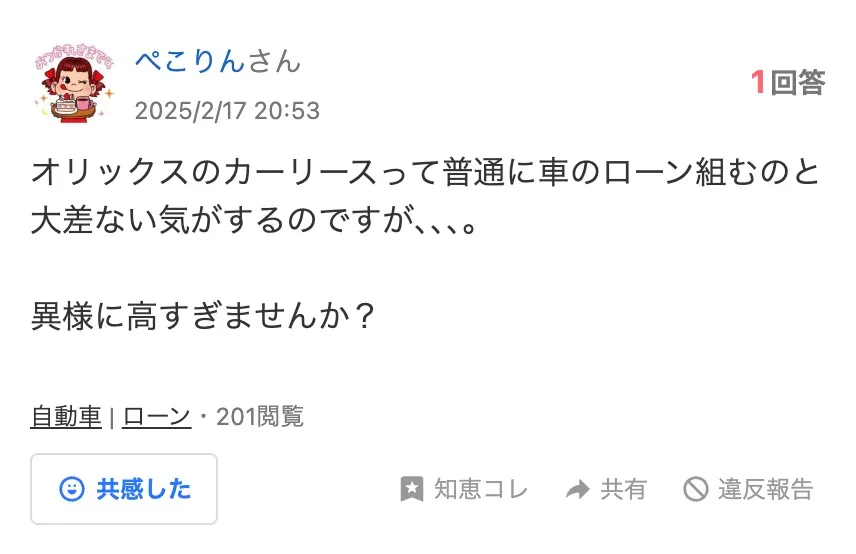 オリックスのカーリースって普通に車のローン組むのと大差ない気がするのですが、、、。異様に高すぎませんか?(Yahoo!知恵袋より)