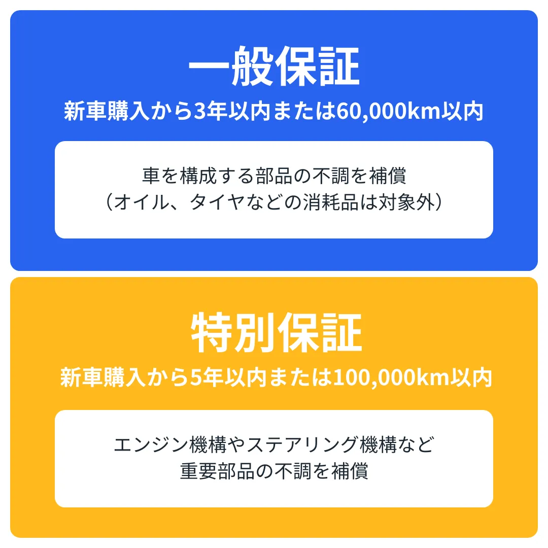これに対して、カルモくんで新車を利用すれば新車1ヶ月点検に加えて、メーカー保証(一般保証・特別保証)がしっかりと付帯している。