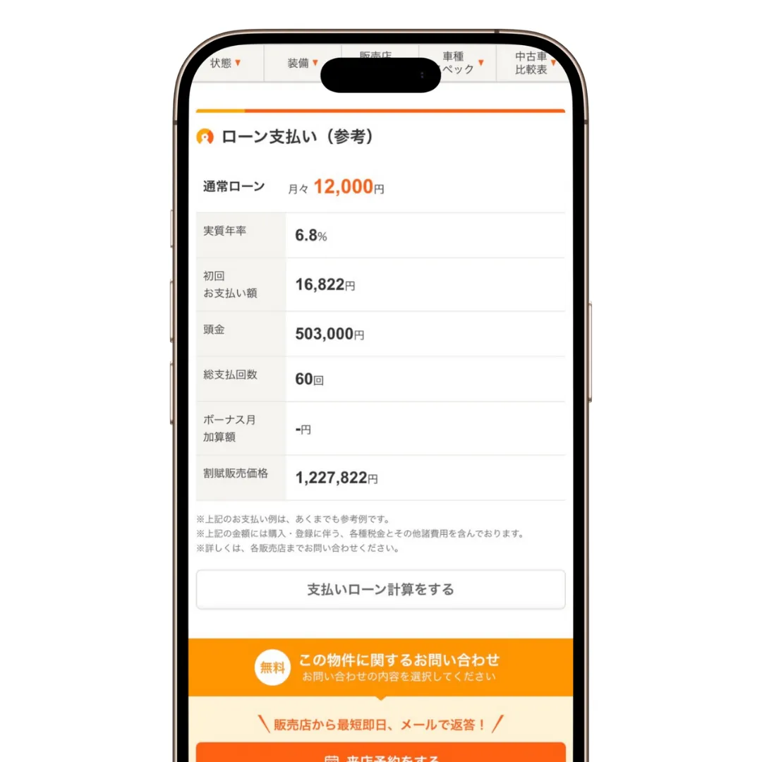 カーセンサーのマイカーローン金利を紹介したところで、注意点についても触れておこう。カーセンサーで中古車の個別情報ページを表示すると、以下の画像のようにマイカーローン金利を確認できる。