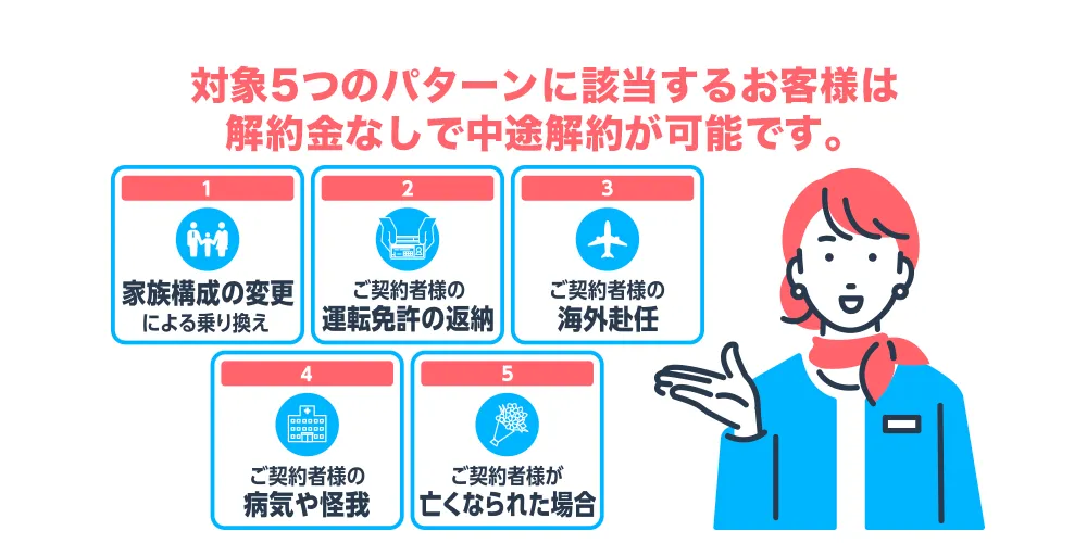 コスモマイカーリースの中途解約サービスは、「家族構成変更に伴い乗り換え」「運転免許証の返納」「海外赴任」「病気や怪我」「死亡」という5つのパターンにおいて、解約金なしでの中途解約が可能だ。