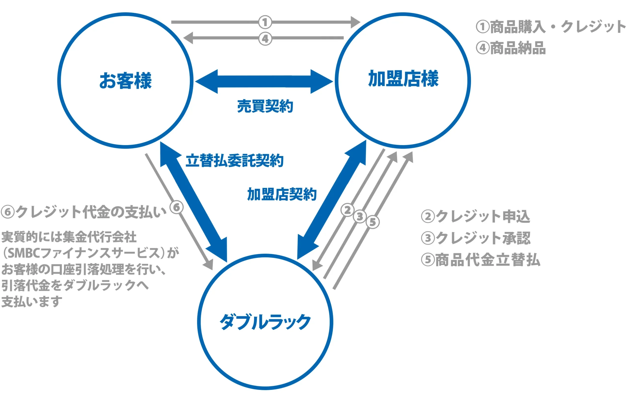 上記のとおり、だれでもマイカーの利用者はダブルラックと契約を締結するものの、実際に集金を行うのはSMBCファイナンスサービスである。ひとつの信用回復ローンを利用するために3社が介在する形になり、サービスの仕組みが複雑だ。