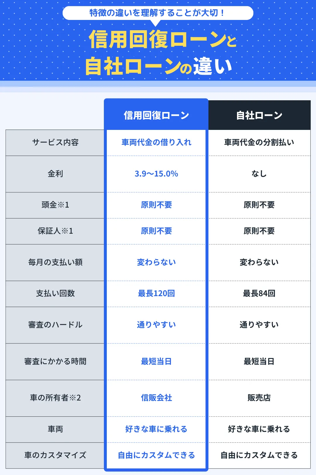 上記の通り、信用回復ローンは信販会社から車両代金を借り入れるサービスであり、自社ローンは中古車販売店との直接契約により車両代金を分割で支払うサービスだ。このため、自社ローンは金利ゼロで利用できる。