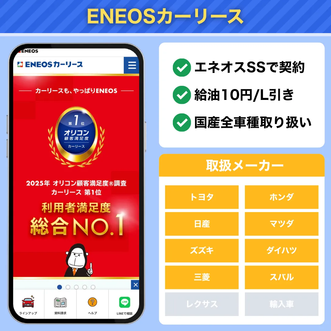 ENEOSカーリースは、ENEOSホールディングスの完全子会社であるENEOS株式会社が提供しているカーリースです。店舗数は業界No.1であり、全国に1万ヶ所以上展開しています。