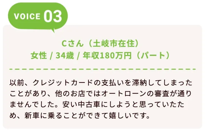 つまり、過去に返済延滞や債務整理(任意整理や自己破産の申し立てなど)を行ったかどうかではなく、「購入する車に対して収入額は十分にあるか」「毎月しっかりと支払えるか」を重点的にチェックするローンサービスだ。