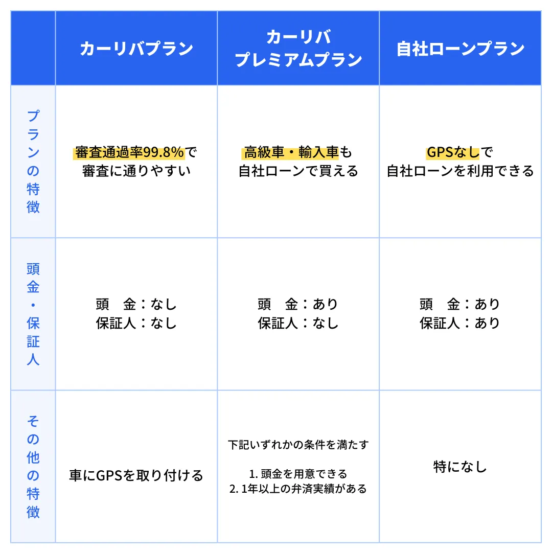 自社ローンプランは頭金・保証人を必要とするが、GPSなしで車を買えるのが特徴だ。また、カーリバの自社ローンプランは、最大60回の支払いに対応している。自社ローンの支払い回数は最大48回が一般的だ。カーリバなら、最大60回の支払いにより毎月の負担額を抑えることができる。