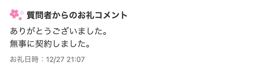 ありがとうございました。無事に契約しました。(Yahoo!知恵袋より)