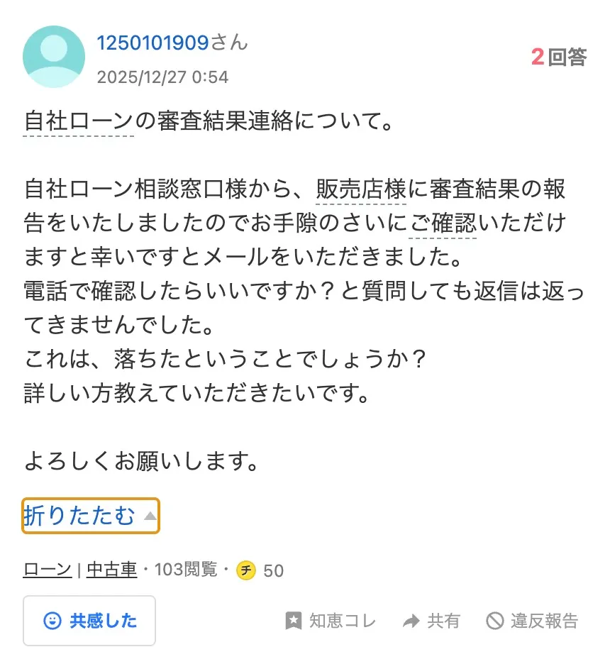 質問者はどうやら実際に自社ローンの窓口を利用し、加盟している中古車販売店から仮審査結果を得たようだ。しかし、確認のメール(LINE)を送信しても返答がないため、これに不安を抱えている。