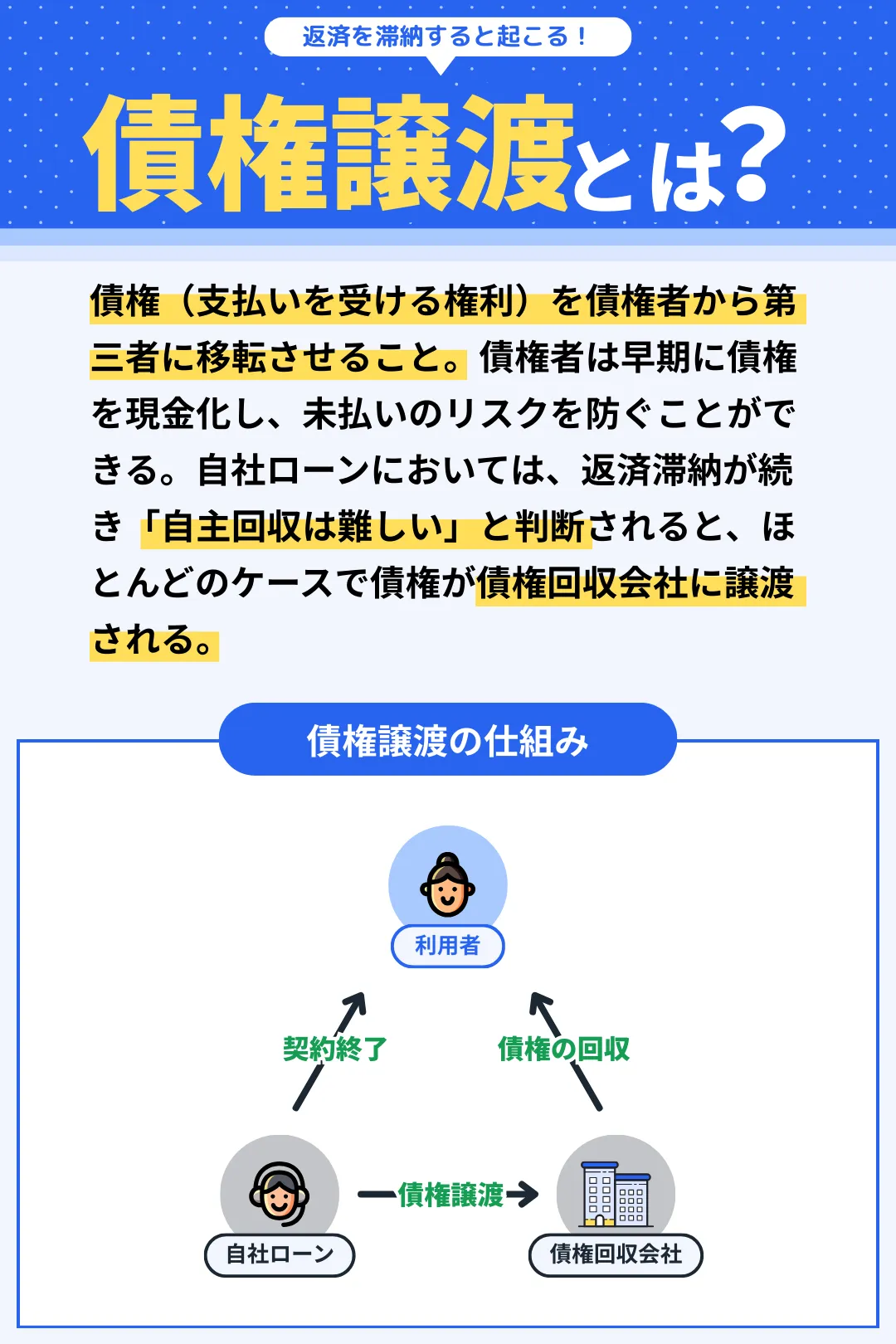 たとえば、たった数日間でも返済を滞納すれば、自社ローンからの信用が落ち、債権回収会社に債権を譲渡される可能性が高い。