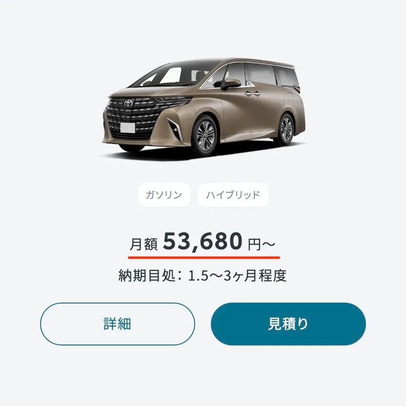人気車種は納車まで時間がかかる。アルファードを正規販売店で購入する場合、納車までにかかる期間は「6ヶ月〜1年」考えられる(記事制作時点では受注停止状態)。一方で、KINTOならアルファードを「1.5〜3ヶ月程度」で納車してくれる。