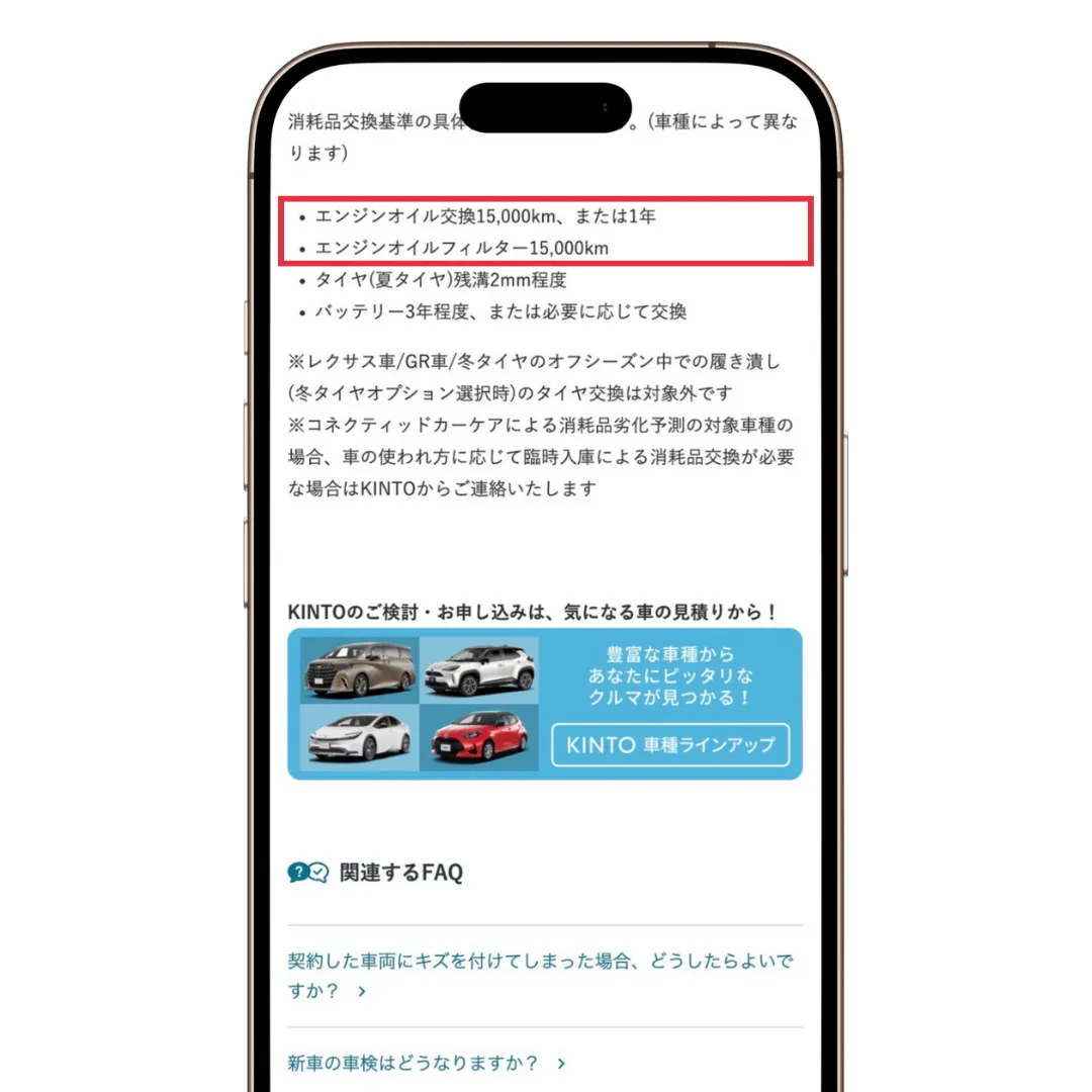 ただし、これらはあくまでKINTOの公式サイトに掲載されている基準であり、実際の交換頻度は担当販売店によって異なるケースが多い。そのため、KINTOの審査に通過し担当販売店から連絡が入った際は、オイル交換などのメンテナンス頻度について質問してみよう。