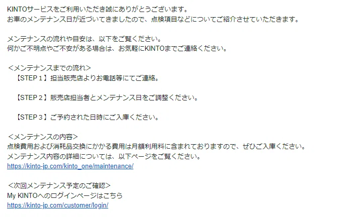 KINTOで契約した車のオイル交換時期が近づくと、KINTOから次のようなメッセージが届く。