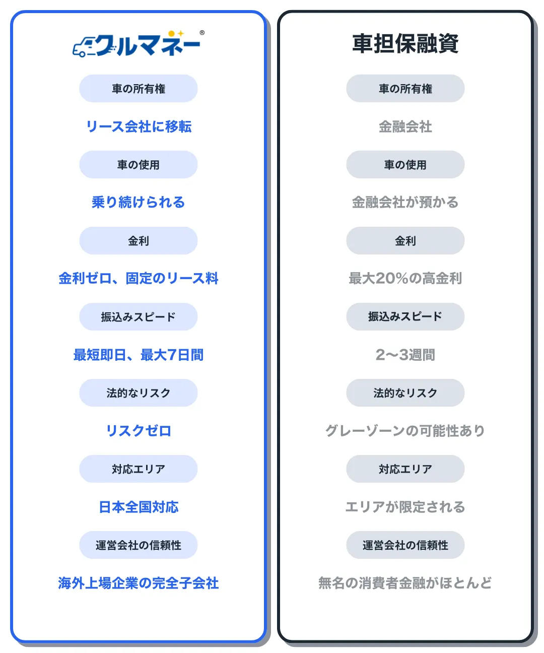 クルマネーは車担保融資と混同されがちだが、これらは仕組みの異なるサービスだ。車担保融資は愛車を担保に利用するローンであり、金利とそれに応じた利息が発生する。