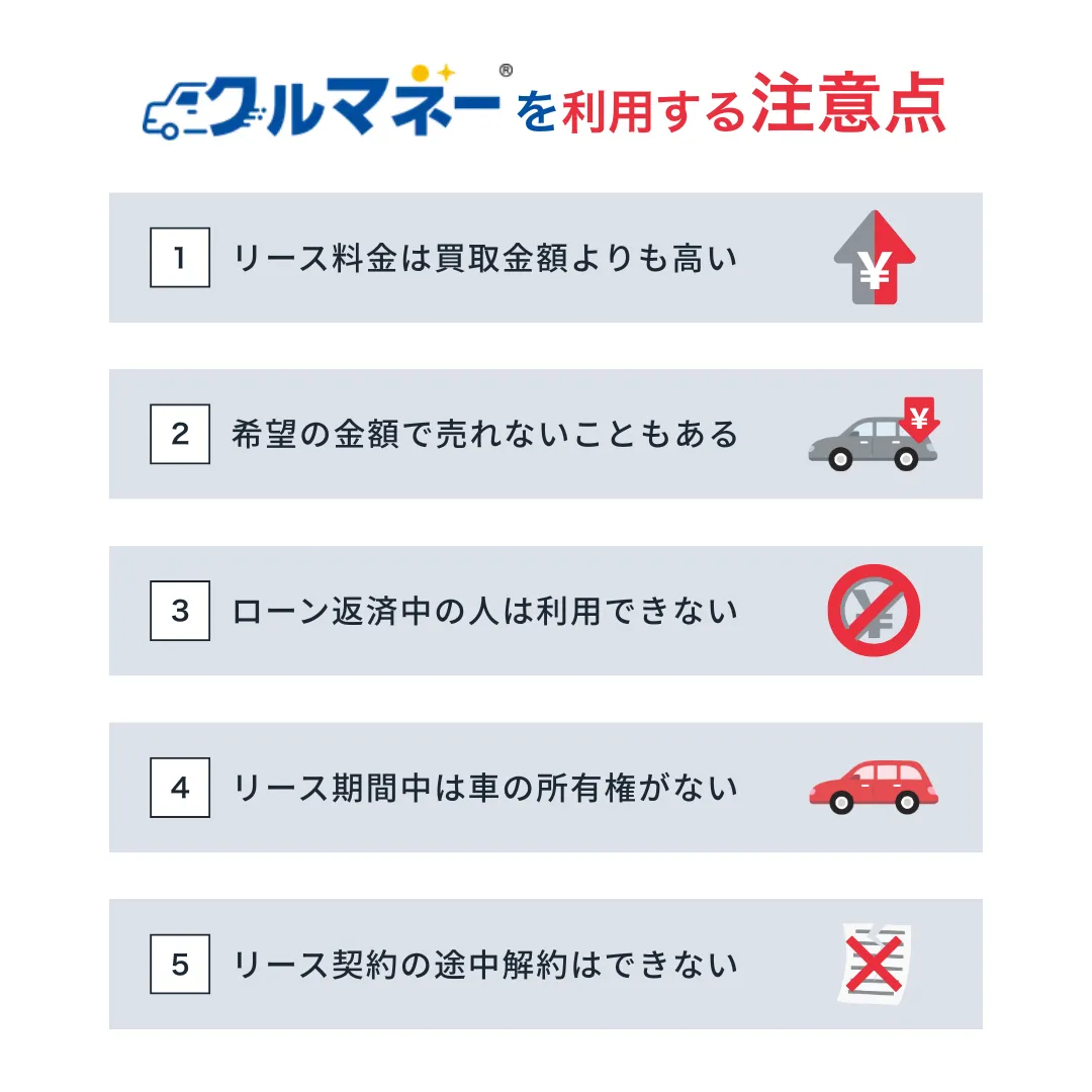 クルマネーはメリットの多いサービスだが、以下のような注意点もある。