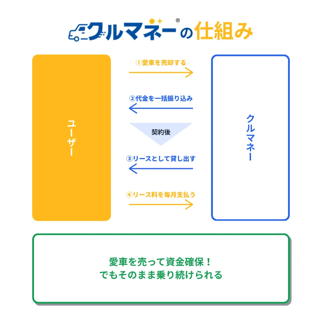 クルマネーは愛車を売ってまとまった資金を確保し、売った愛車をリースとして乗り続けるサービスだ。
