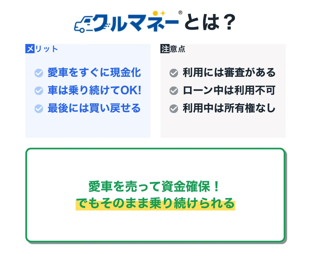 クルマネーは愛車を売って資金を確保し、リースとして愛車に乗り続けられるサービスだ。最終的に買い戻すことはできるが、リース期間中は車の所有権がないことを覚えておこう。