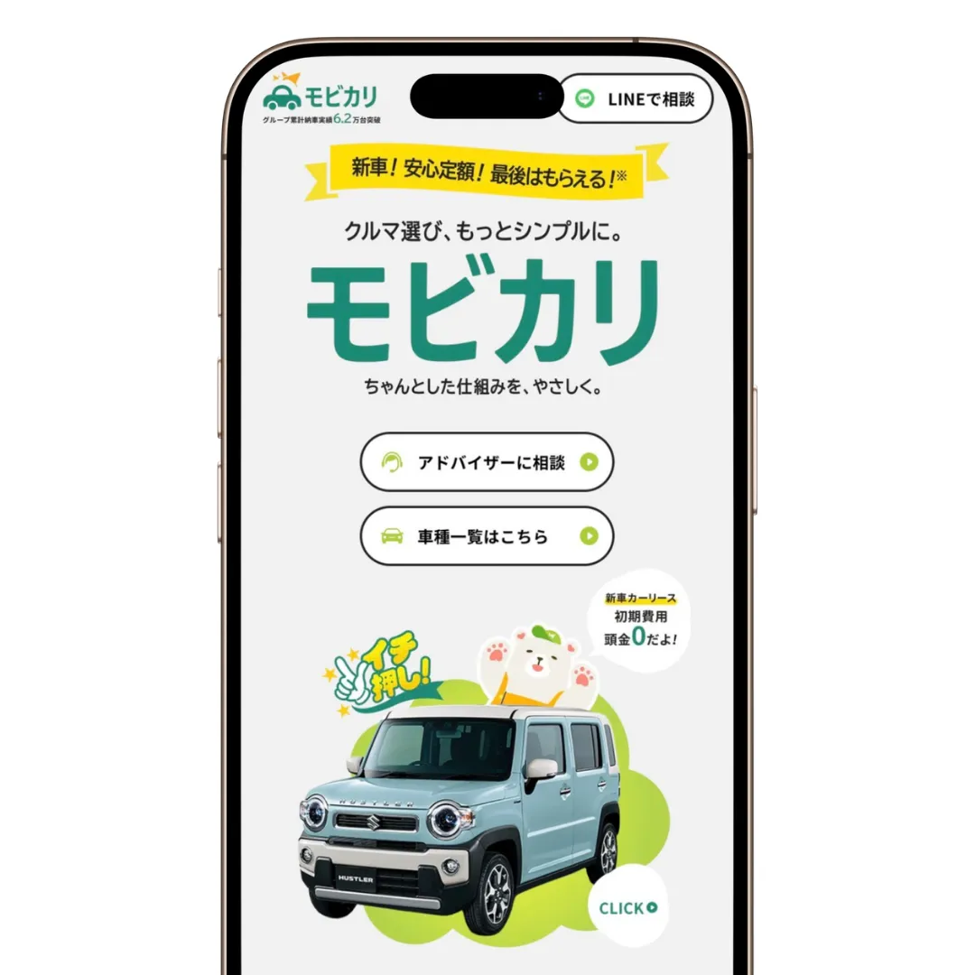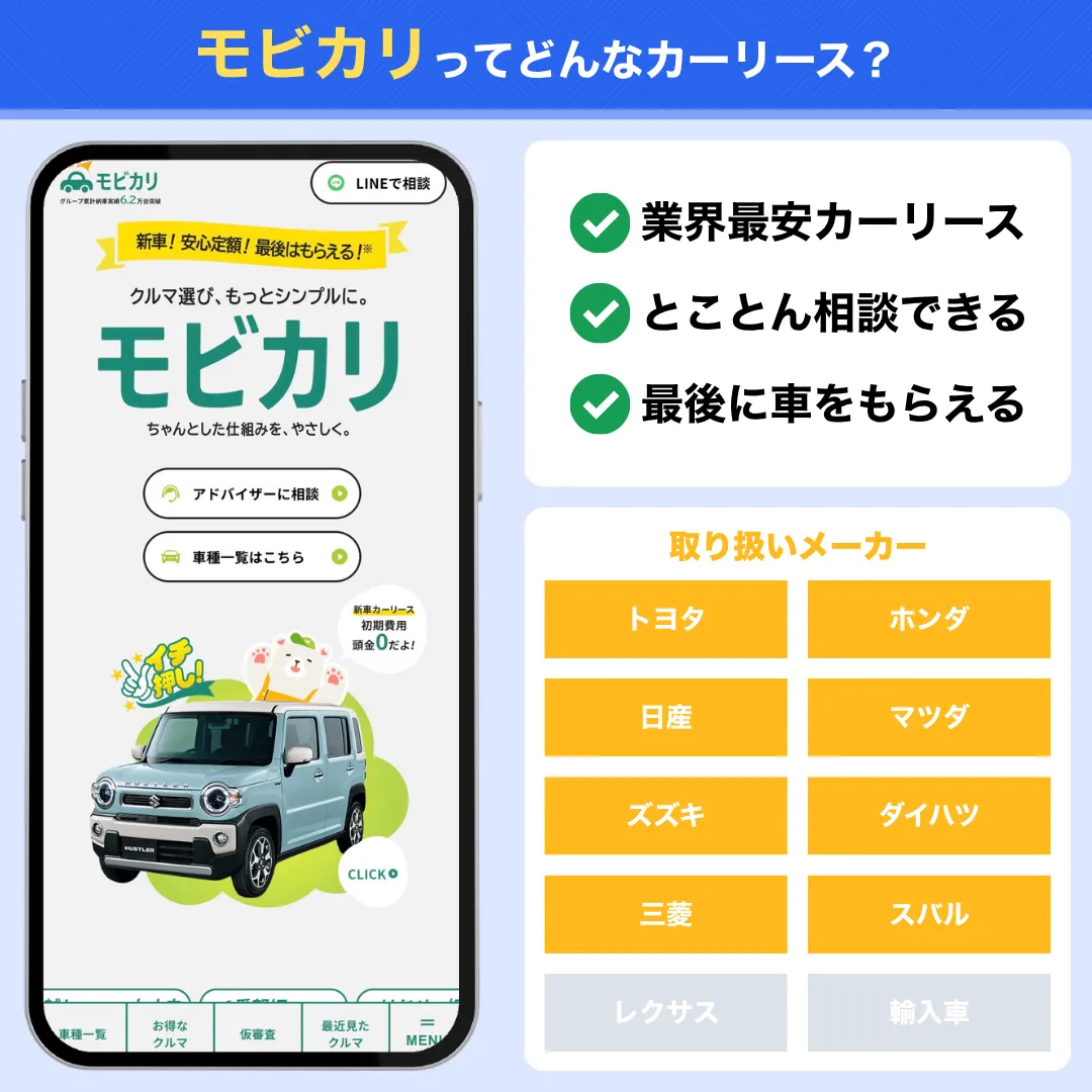 モビカリは、2026年3月に誕生した新しいカーリースです。特徴として月額がとにかく安く、相談型カーリースとして契約前〜契約終了までユーザーに寄り添ったサービスを提供しています。
