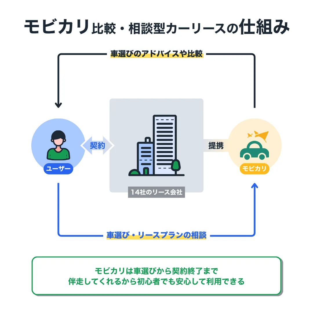 モビカリは比較・相談型カーリースとして、14社のリース会社と提携しています。一般的なカーリースの提携社数は1社または2社なので、モビカリは一般の10倍または7倍も提携社数が多いことになります。