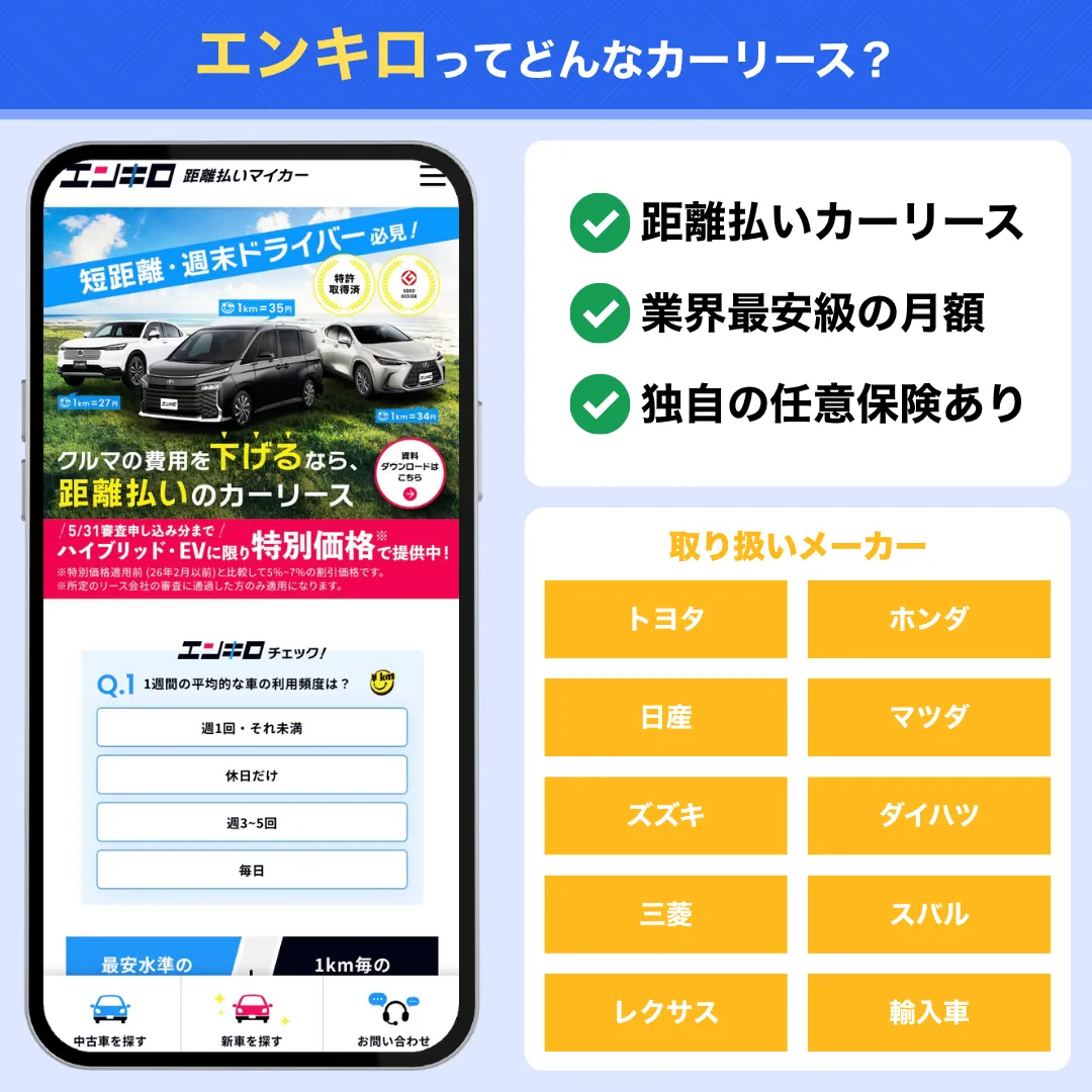 業界最高水準の安さを誇るモビカリですが、実はモビカリ以上に安いカーリースが存在します。それは「エンキロ」というカーリースです。