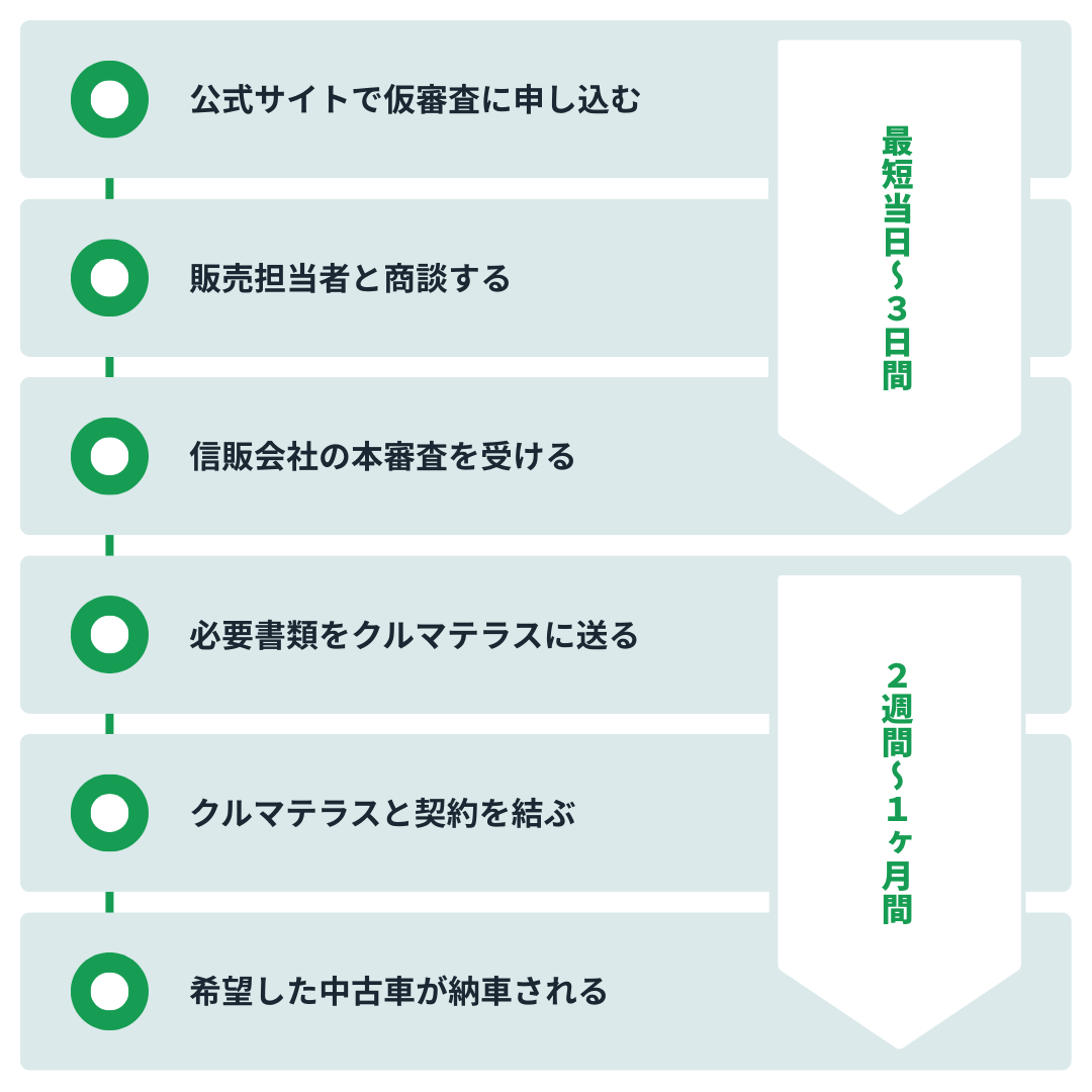 クルマテラスは実店舗だけでなく、公式サイトからの仮審査申し込みを受け付けている。申し込みは1分ほどで完了し、最短30分で審査が届く。その後は販売担当者と商談し、信販会社の本審査を受けるのが一般的な流れである。