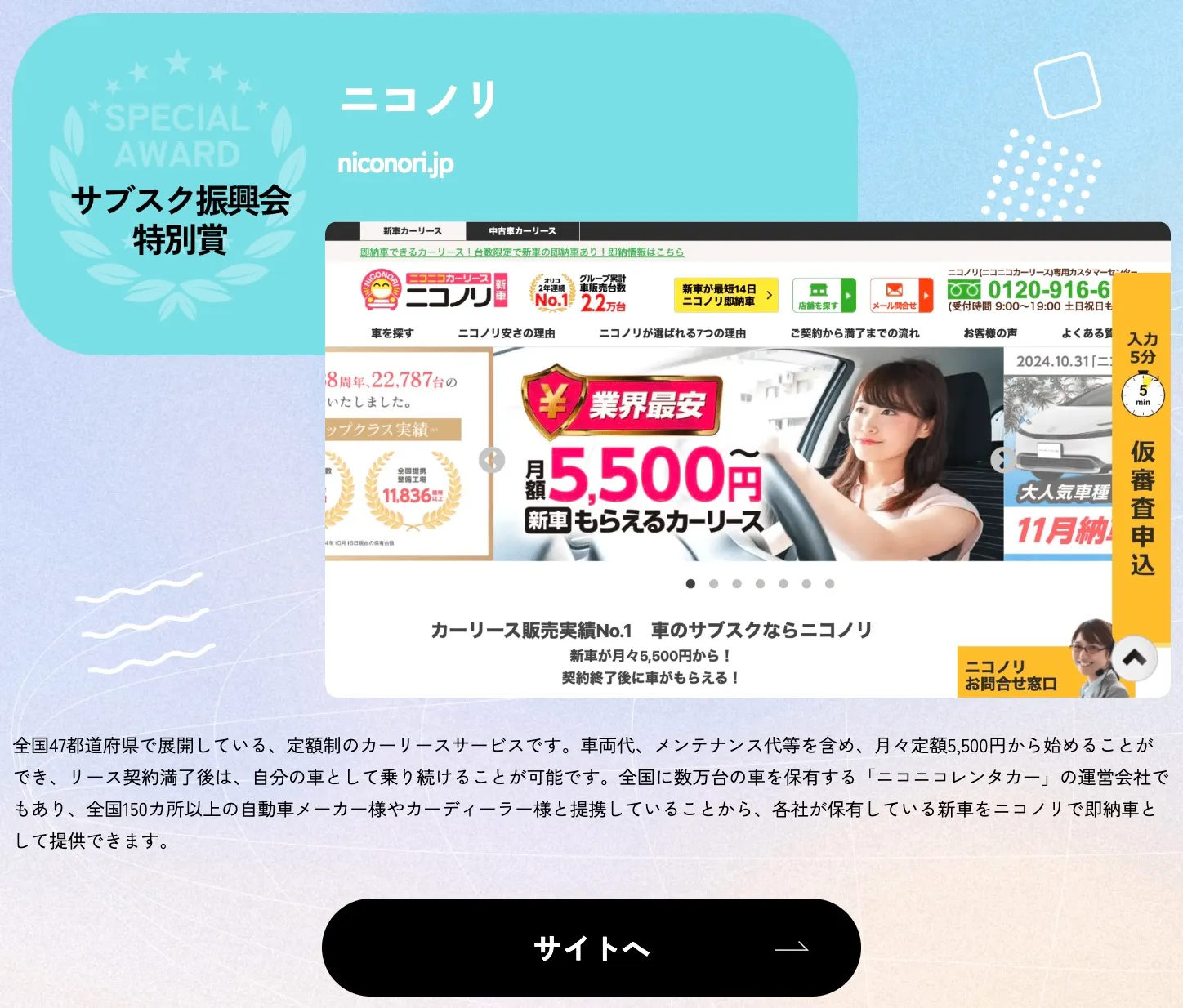 ニコノリは、2015年7月にサービス提供を始めた比較的老舗のカーリースだ。