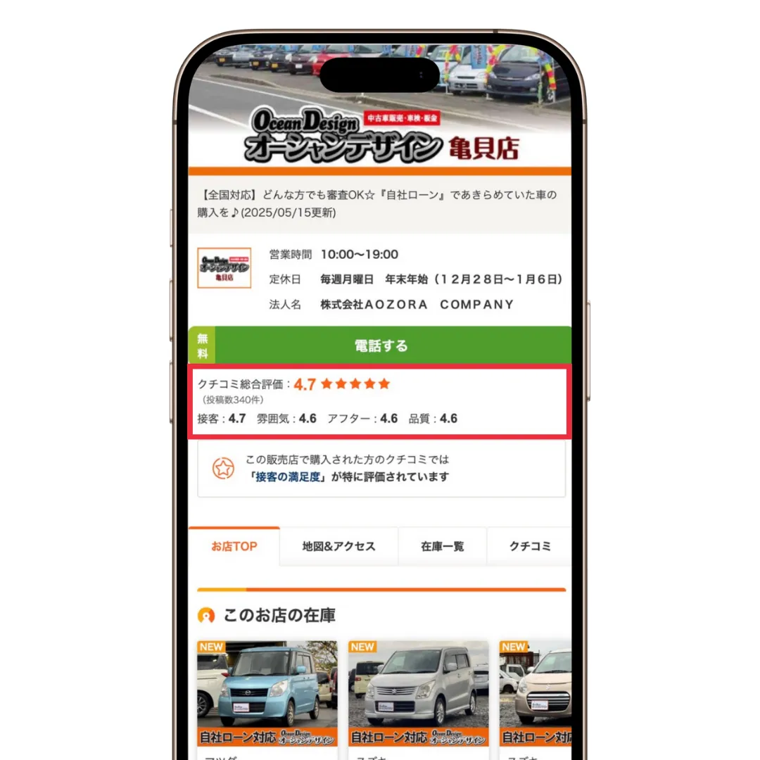 自社ローンに対して「やばい」という声は多いが、実際のところ、自社ローンは決してやばいサービスではない。たとえば、カーセンサーにおけるオーシャンデザイン亀貝店(本社店舗)の評価は星4.7と非常に高い。