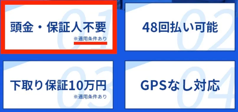 残念ながら、公式サイトには詳しい適用条件までは記載されていない。ただし、頭金なしの適用条件は以下のようなものだと考えられる。