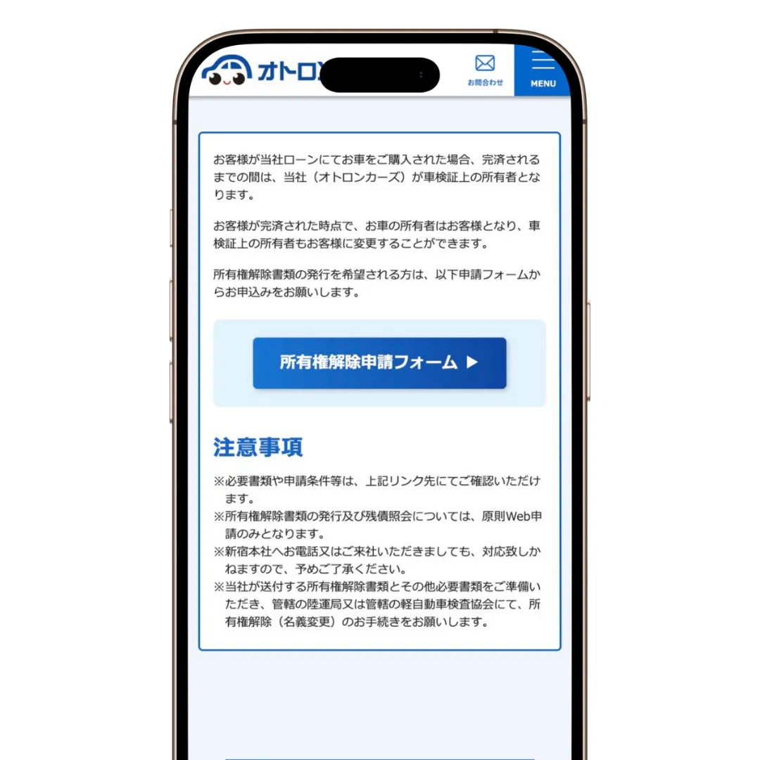 オトロンは業界大手の自社ローンであり、所有権解除のための申請フォームをしっかりと公式サイトに設置している。通常は中古車販売店と電話などで直接やり取りする必要があるため、その点でオトロンは安心感のある自社ローンだ。